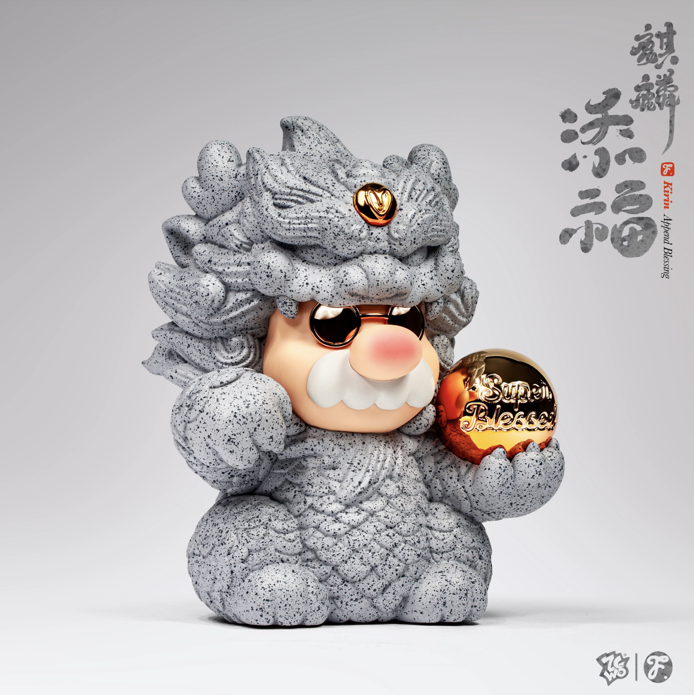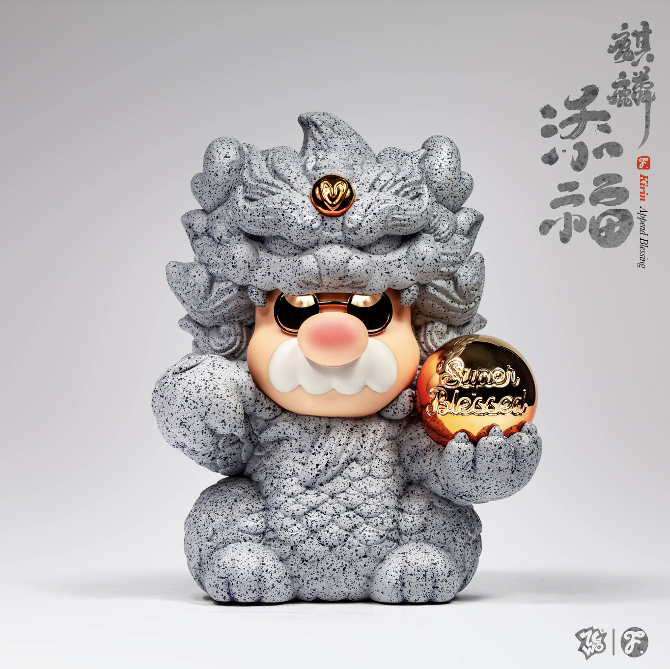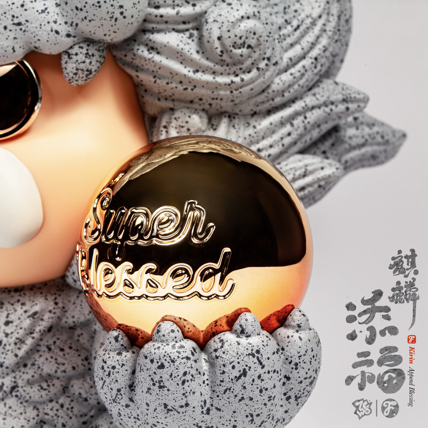 石紋肌理覆身,雙手捧著金色圓球——寫著 “Super Blessed”